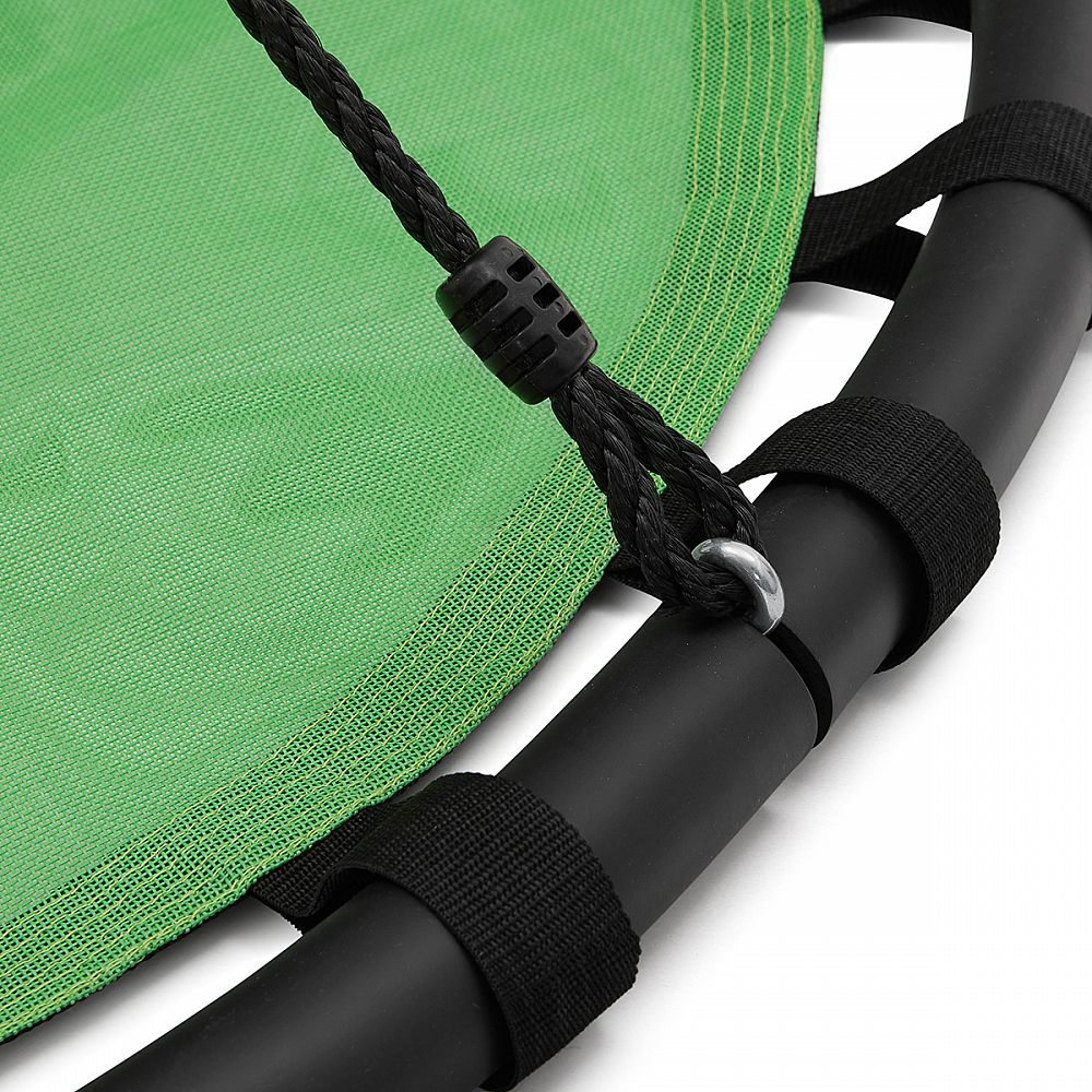 Rám o průměru 120 centimetrů je vyroben z ocelové kulatiny o průměru 25 milimetrů, na které je pro maximální bezpečí nalepena vysoká vrstva PE pěny. Textilní potah modelu NB5036 je maximálně odolný vůči povětrnostím vlivům jako je déšť a sníh, hnízdo tak nemusíte schovávat když zrovna začne pršet. Nosná, polyetylénová lanka mají průměr 10 milimetrů a délku 180 cm. Když tyto vlastnosti zkombinujeme tak získáme prostornou houpačku s nosností 150 kilogramů, na které se vyřádí i více dětí najednou.
