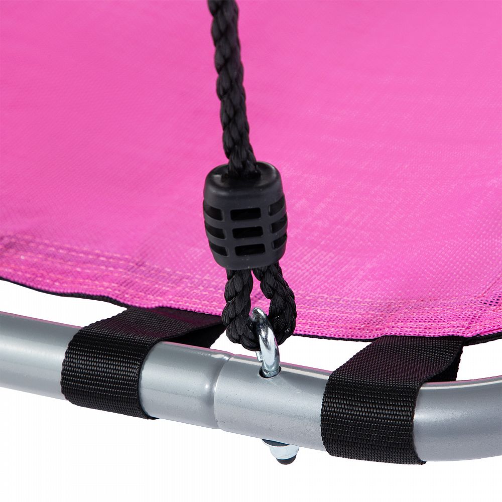 Rám je vyroben z odolné oceli o průměru 25 mm a tloušťce stěny 1,4 mm, což zajišťuje stabilitu a trvanlivost celé konstrukce. Lana o délce 180 cm a tloušťce 1 cm umožňují rychlou montáž houpačky na větve stromů, dřevěné trámy nebo jiné konstrukční prvky. Maximální nosnost až 150 kg zajišťuje bezpečné používání pro děti i dospělé.