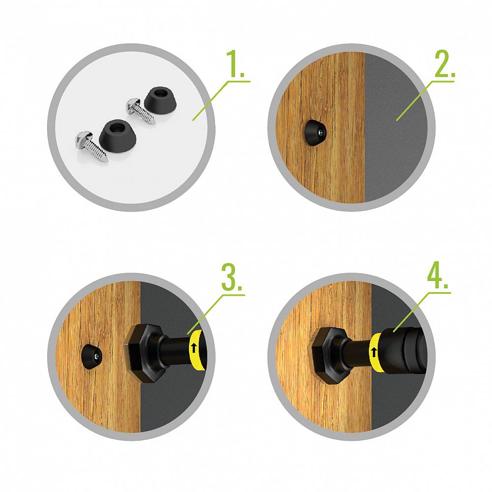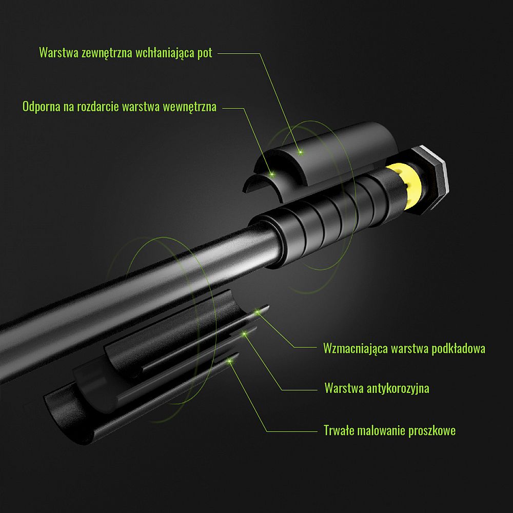 Koncovky hrazdy jsou opatřeny vrstvou silikonu, který zamezuje sesunutí hrazdy ze svého místa, pro ještě pevnější instalaci jsou součástí balení 2 gumové zarážky, které se našroubují do zárubní a hrazda se nasadí na ně. Speciální, žlutá objímka je posuvná a zamezuje povolení dotažené hrazdy. Pěnové návleky jsou opatřeny vrstvou, která odvádí pot a tím zamezuje sklouznutí dlaně. Ocelová konstrukce je ošetřena základovou barvou, antikorozní vrstvou a práškovým lakem.