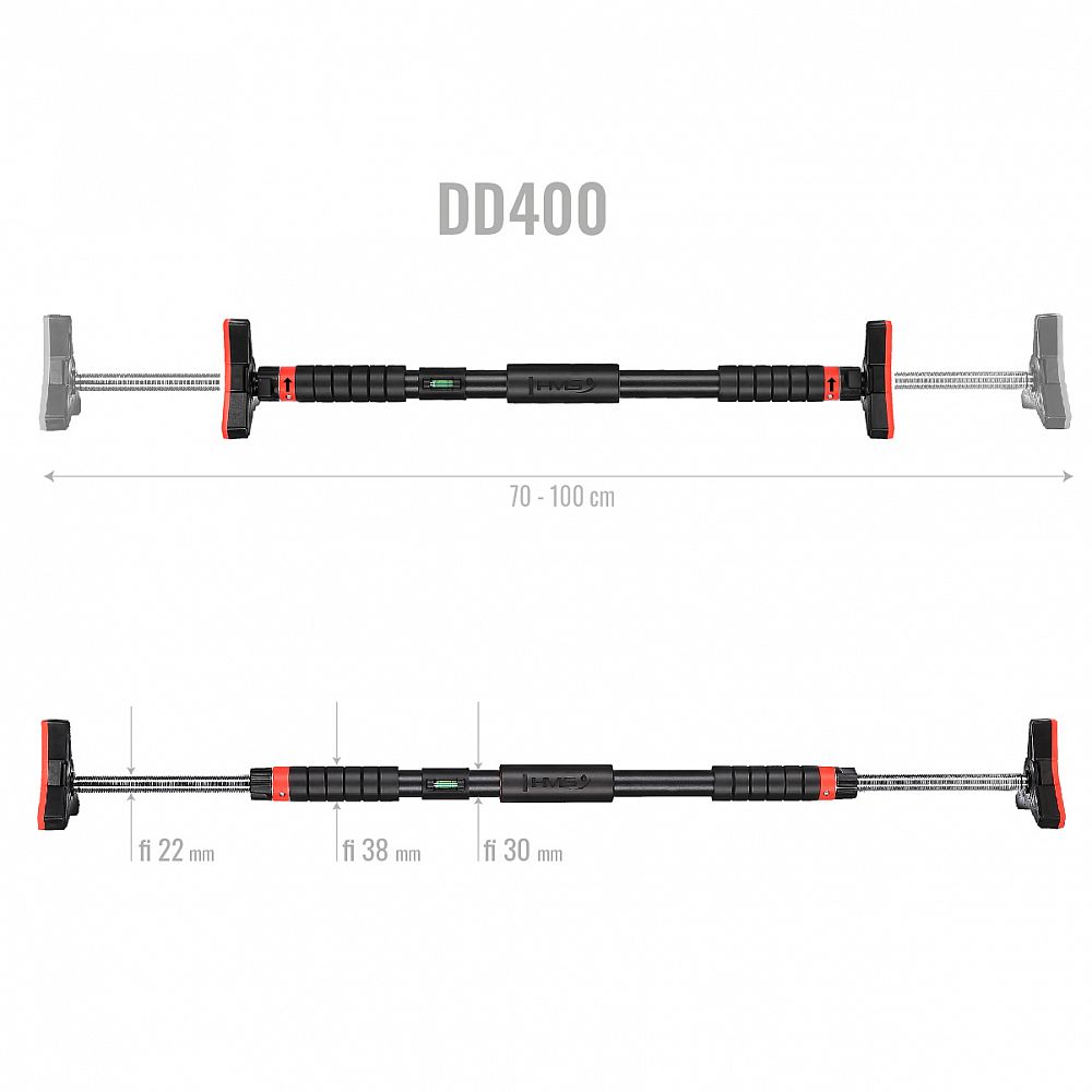 Po vytažení hrazdy z balení se na její konce nasadí koncovky. Hrazdu si na zemi roztáhneme tak, aby byla o několik centimetrů kratší, než je šířka zárubní a dotažením černých matic zajistíme délku hrazdy. DD400 vložíme do zárubní, pomocí dodávané vodováhy ji vyrovnáme a dotáhneme černé matice. Jakmile hrazda drží, tak si z koncovek vytáhneme klíč, který si prodloužíme pomocí nástavce a následně dotáhneme černé matice tak, aby hrazda pevně držela. Nástavec a vodováhu si uschováme pro další použití, klíče nacvakneme zpět do koncovek a můžeme začít s tréninkem.