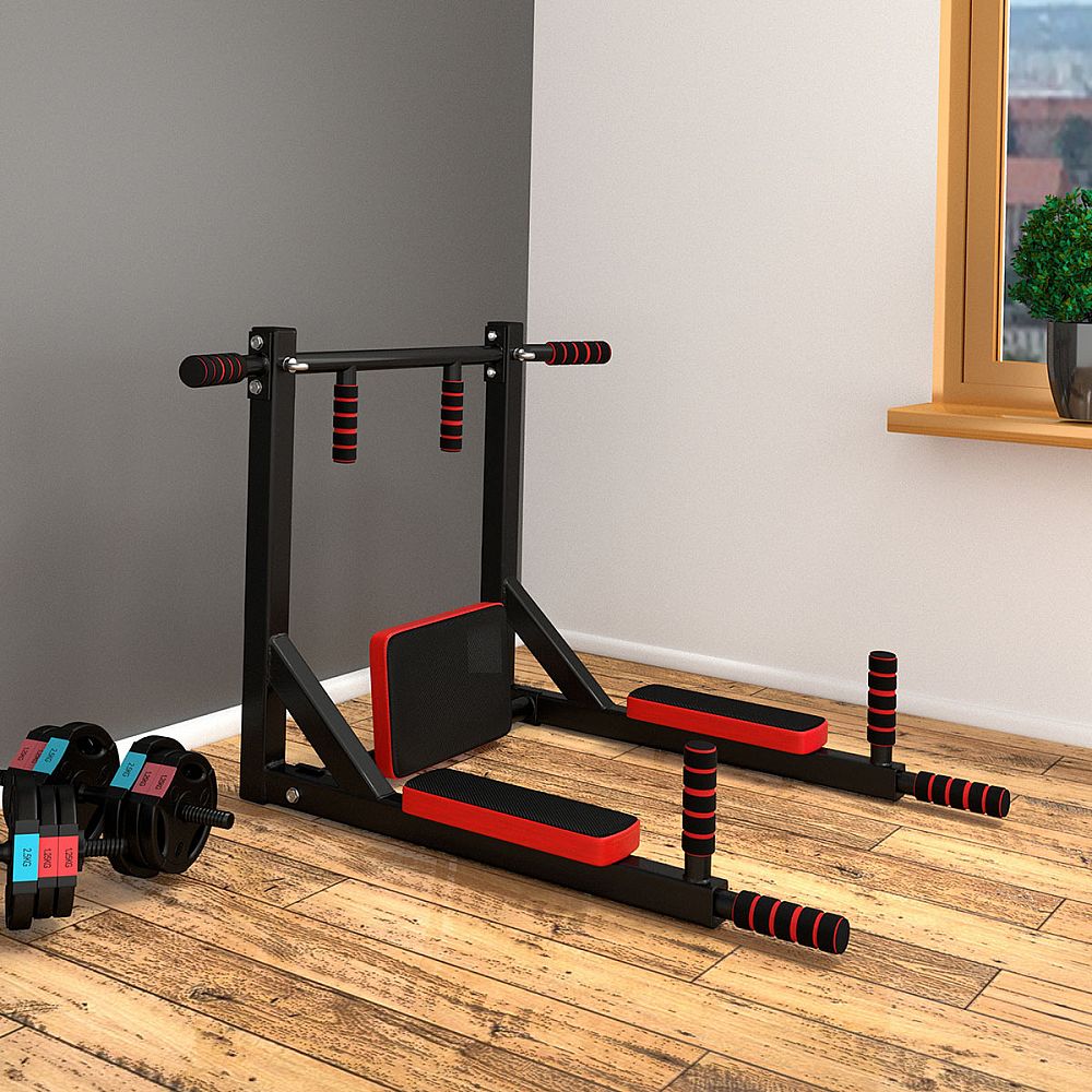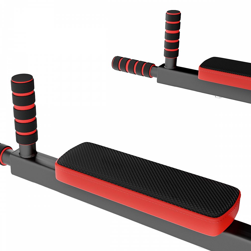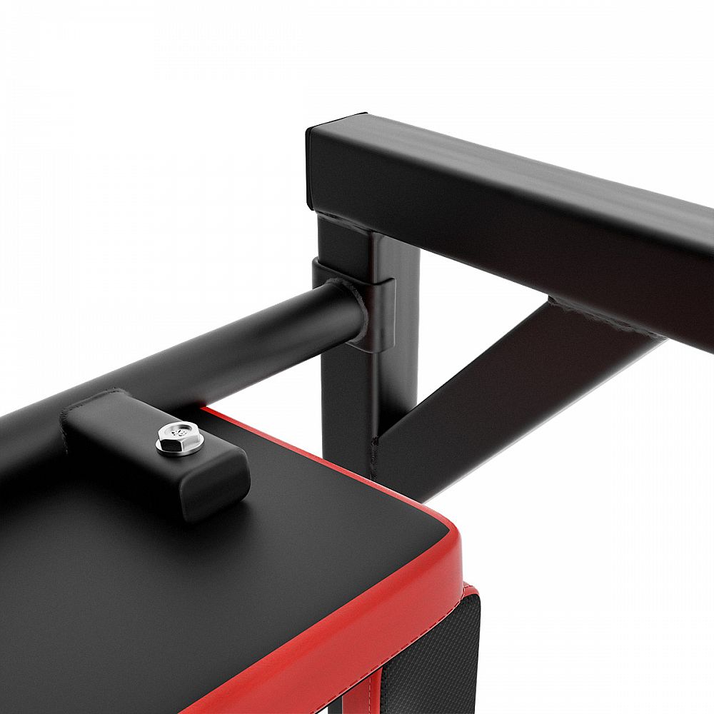 Pokud tedy do háků zavěsíme osu hrazdy, pak budou v pracovní poloze bradla, na kterých můžeme trénovat přítahy nohou k břichu, předkopávání, dipy a podobně. Bradla mají pohodlnou zádovou opěrku a 2 opěrky pro lokty.