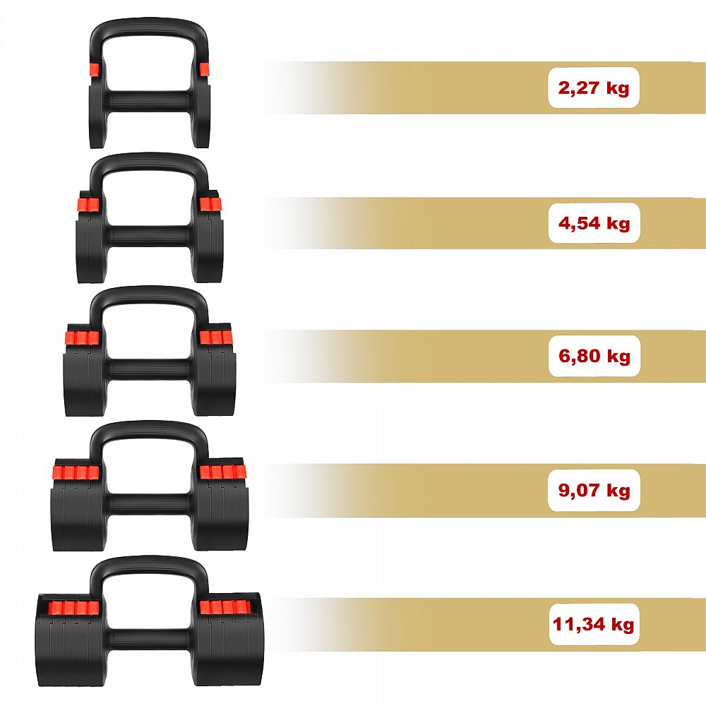 - 5stupňová regulace zátěže: 5 / 10 / 15 / 20 / 25 lbs (cca 2,27 / 4,54 / 6,80 / 9,07 / 11,34 kg).