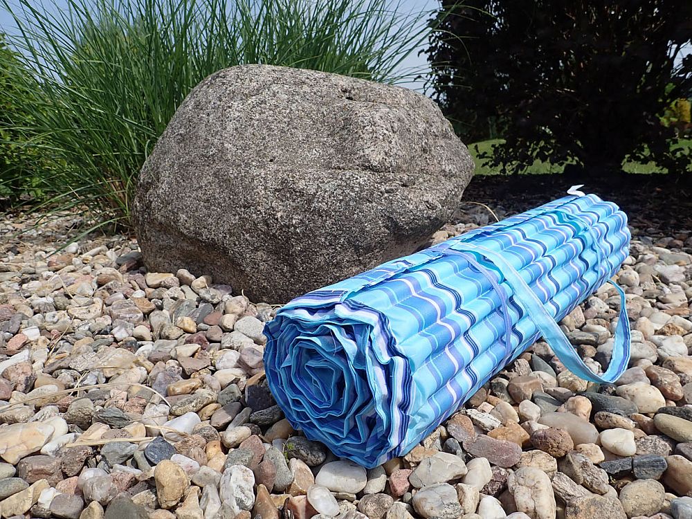 Plážové rolovací lehátko modré – nový a velmi skladný typ lehátka o rozměru 170 x 55 x 1,5 cm. Výplní jsou trubky z nenasáklivého molitanu, do sebe vzájemně zapadající a umožňující úsporné složení lehátka do úhledného balíčku. Rozměr balíčku je 9,5 cm průměr x 55 cm délka. Potah je bavlněný s příměsí polyesteru kvůli omezení nasáklivosti. NEPRAT V PRAČCE, ale pouze ručně v mýdlové vodě. Neždímat!