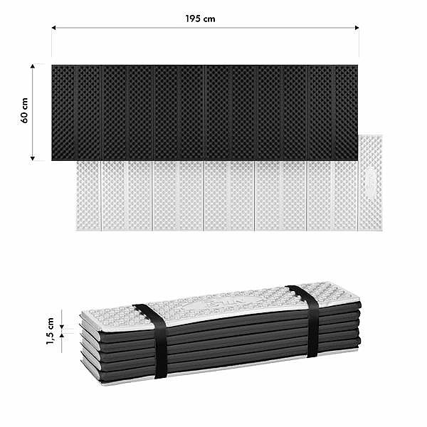 Podložka má délku až 195 cm, což umožňuje pohodlný odpočinek i pro vyšší osoby. Šířka 60 cm a tloušťka 1,5 cm zajišťují pohodlnou oporu a izolaci od podkladu, a to i na nerovném terénu.