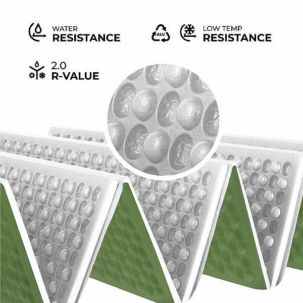 Jádro karimatky je vyrobeno z technické pěny XPE – materiálu, který se vyznačuje nízkou hmotností, vynikající odolností proti deformaci a mechanickému poškození. Pěna XPE nesaje vodu, což znamená, že karimatka zůstává suchá a připravená k použití i v náročných terénních podmínkách.
