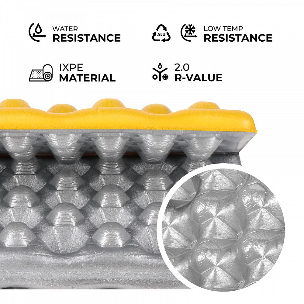 Podložka je vyrobena z vysoce kvalitní pěny IXPE – materiálu, který se vyznačuje zvýšenou pružností a odolností, a zároveň zůstává lehký, odolný a nesaje vodu. IXPE si zachovává svůj tvar i při intenzivním používání, což zaručuje dlouhodobý komfort.