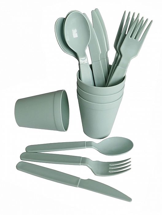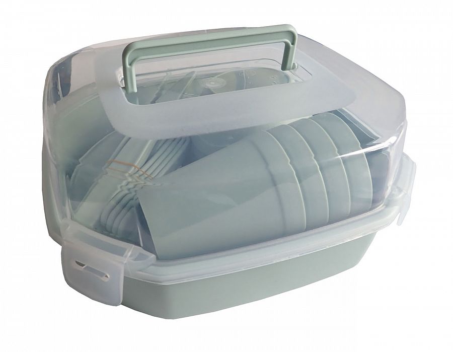 Kempingová sada plastového nádobí se skládá z 26 ks součástí. Obsahuje 4 plastové talíře o průměru 23,5 cm, 4 plastové kelímky o objemu 250 ml, 4 plastové misky o objemu 0,35 l, 4 plastové lžíce 18,8 cm, 4 plastové vidličky 18,5 cm, 4 plastové nože 18,7 cm. Vše uzavřeno v praktické dvoudílné dóze s uchem a oddělitelným víkem, která poslouží i jako další nádobí.Parametry