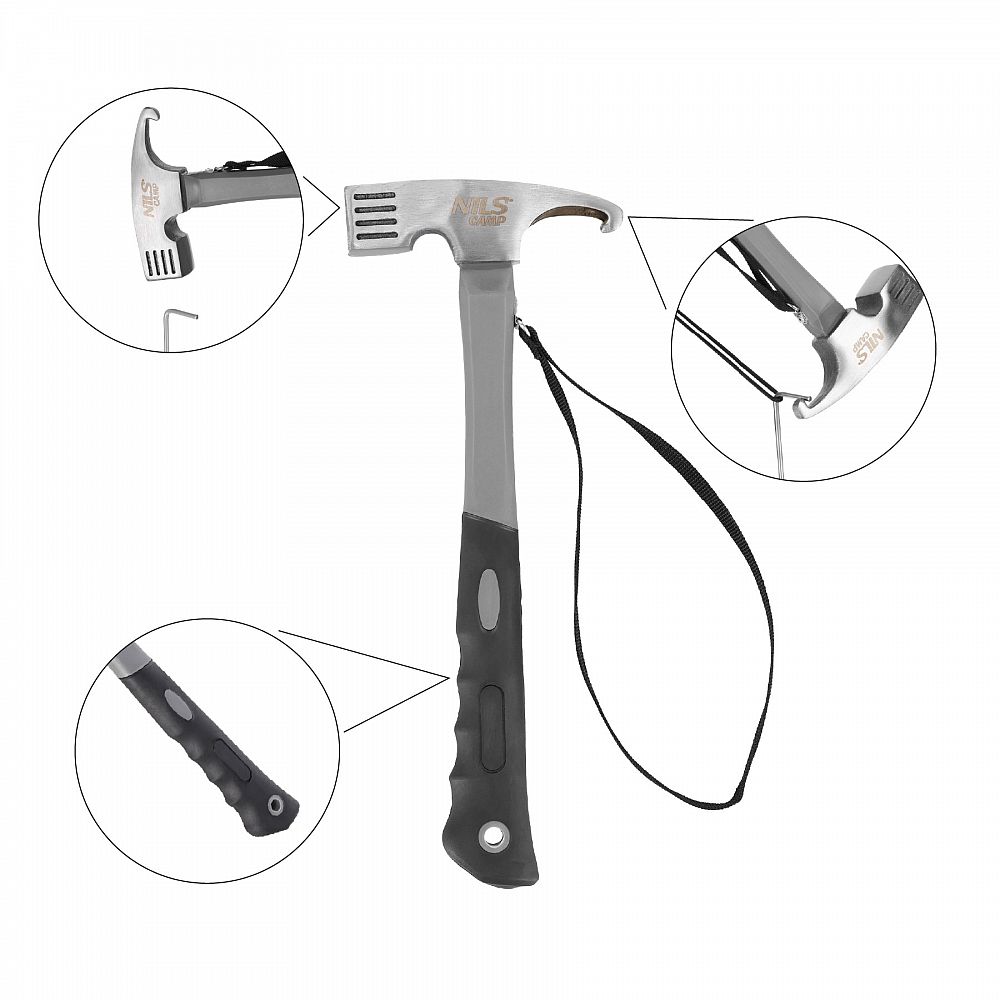 Kempingové kladivo NC17109 značky NILS Camp je nepostradatelným nástrojem ve výbavě každého milovníka kempování, survivalu a outdoorových výprav. Spolehlivě poslouží při zatloukání stanových kolíků nebo budování provizorního tábořiště – je navrženo s důrazem na odolnost a pohodlí při používání v terénu.