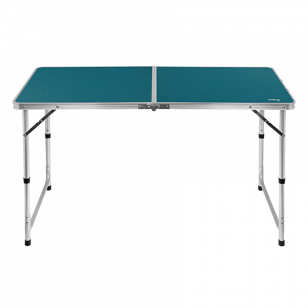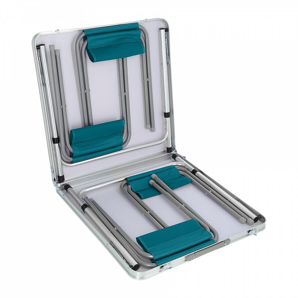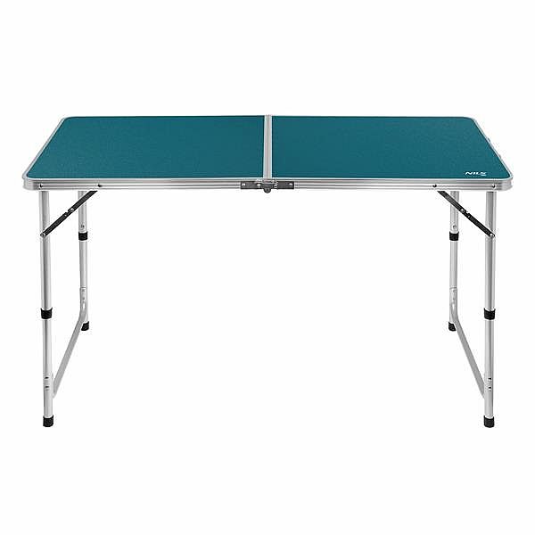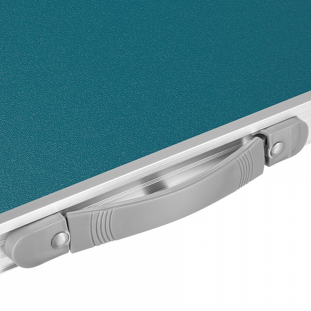 Stůl má desku o rozměrech 120 x 60 cm, která je vyrobena z laminované MDF desky. Pevná, lehká hliníková konstrukce zajišťuje odolnost a stabilitu. Výšku stolu lze nastavit ve třech úrovních (55, 61,5 a 70 cm), což umožňuje pohodlné používání jak dětem, tak dospělým. Stůl se jednoduše skládá – po složení nohou a „přeložení“ na polovinu vznikne kompaktní kufřík o rozměrech 60 x 60 x 6,5 cm. Na boku je praktická rukojeť, která usnadňuje přenášení celé sady.