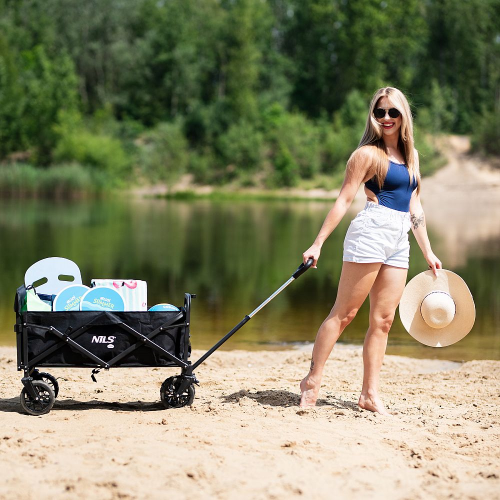 Turistický vozík NILS Camp NC1608 - Vaše mobilní nakládací centrum. S působivou kapacitou 160 litrů pojme tento vozík nejen obrovské množství vybavení, ale také snadno uveze až 100 kg nákladu. To znamená, že si můžete zabalit téměř vše, co potřebujete na rodinnou dovolenou u moře, vícedenní festivaly nebo skupinové kempování – od stanů a spacáků až po zásoby jídla a plážové vybavení.