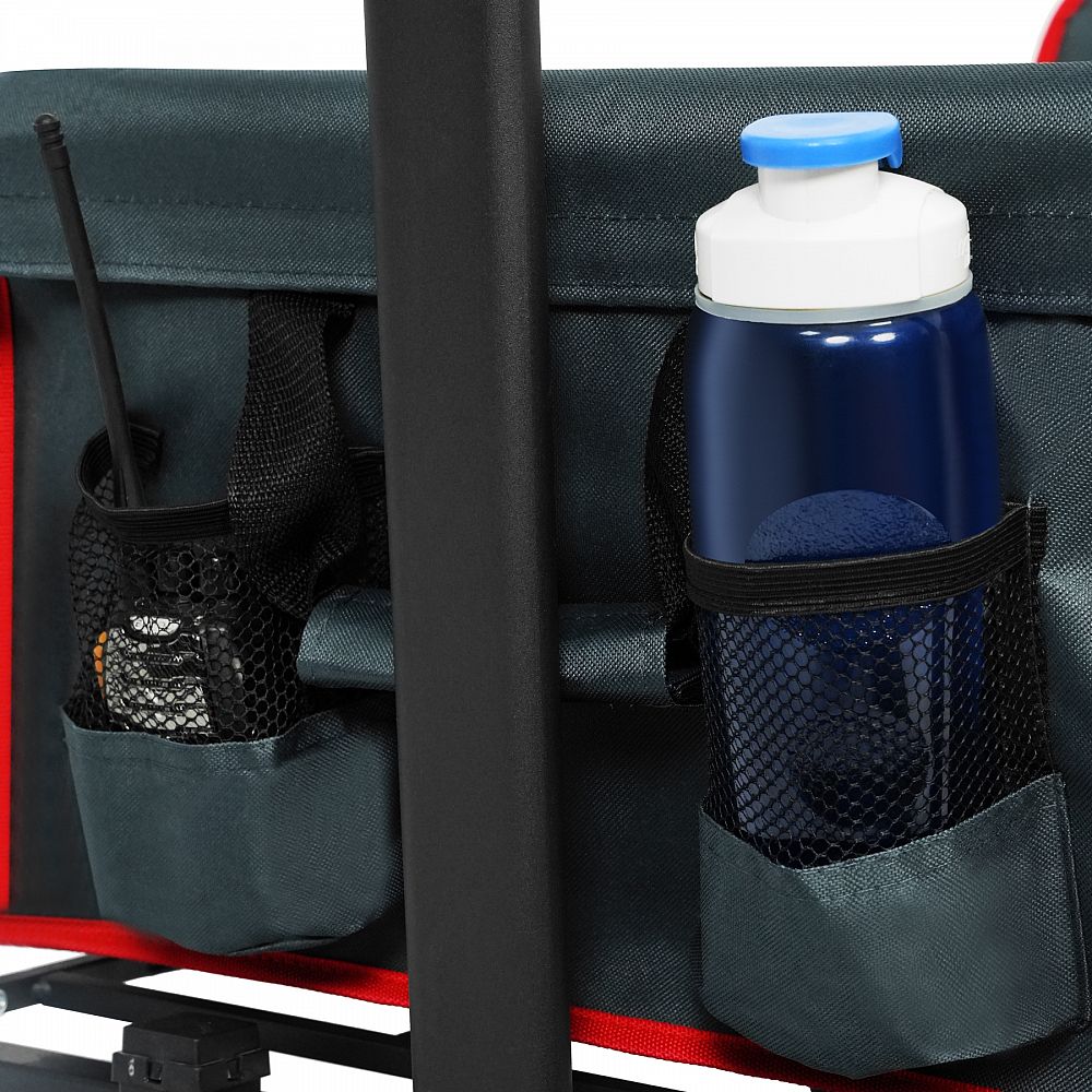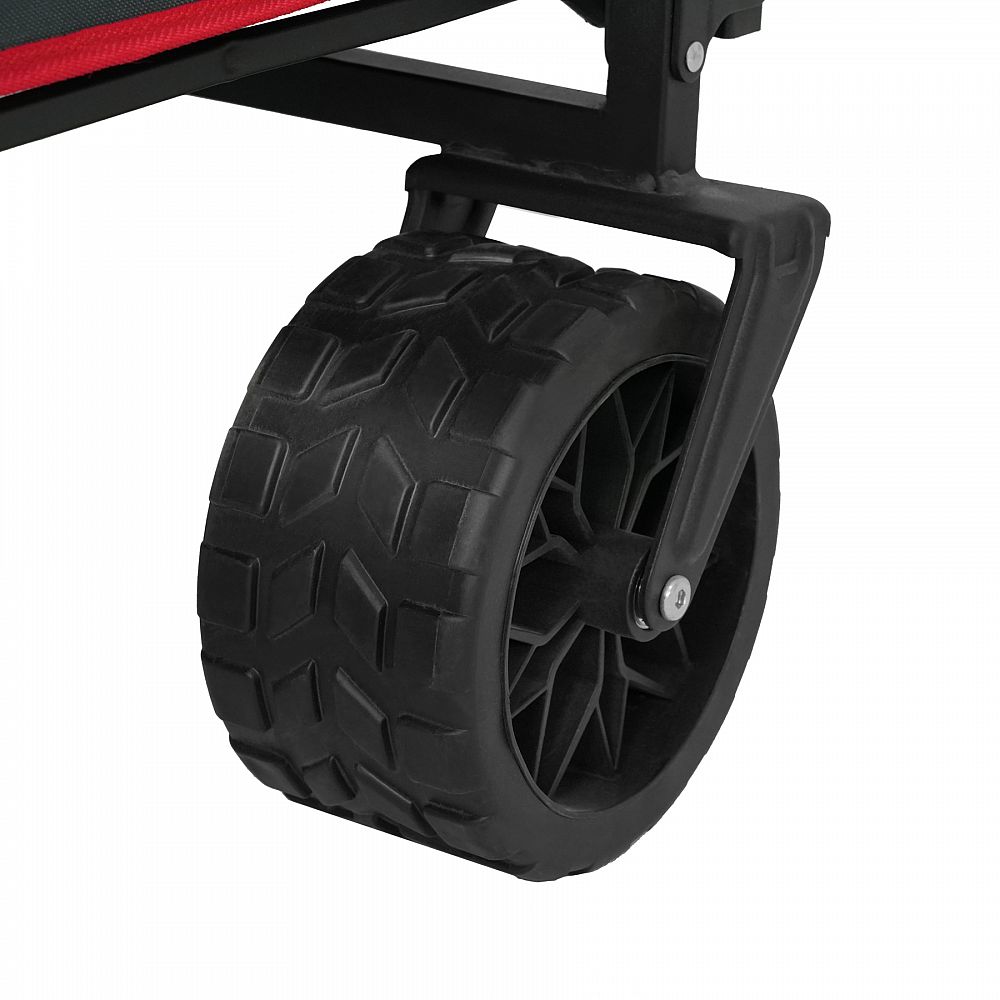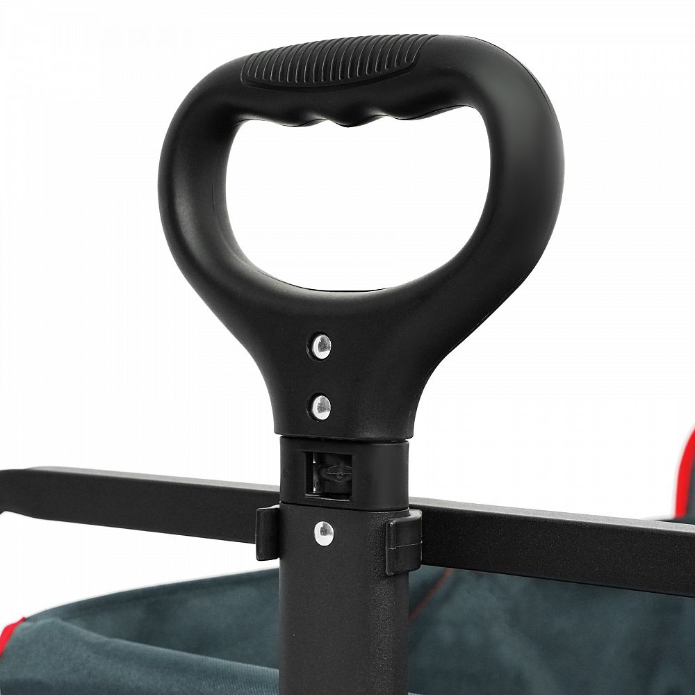 Vozík je navržen s důrazem na pohodlí. Má nastavitelné madlo, které lze přizpůsobit výšce uživatele a zajistit tak ergonomické a pohodlné vedení. Velká široká kola o rozměrech 18 x 10 cm vyrobená z kombinace polypropylenu a PVC zvládají bez problémů různé povrchy – asfalt, trávu i písek. Zadní steňu lze sklopit a uložit tak například delší předměty. Přední kola jsou opatřena brzdami pro zajištění vozíku na místě.