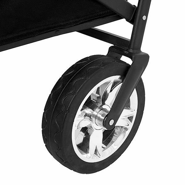 Za hladké vedení zodpovídají čtyři pevná kola o rozměrech 20 x 4,5 cm, vyrobená z kombinace odolného polypropylenu a gumy. Taková konstrukce zajišťuje stabilitu a dobrou přilnavost na různých površích – jak na asfaltu, tak na trávě nebo písku. Nastavitelná rukojeť (v rozmezí 76 až 105 cm) se přizpůsobí výšce uživatele, což významně zvyšuje komfort vedení. Přední kola jsou opatřena brzdami pro zajištění vozíku na místě.