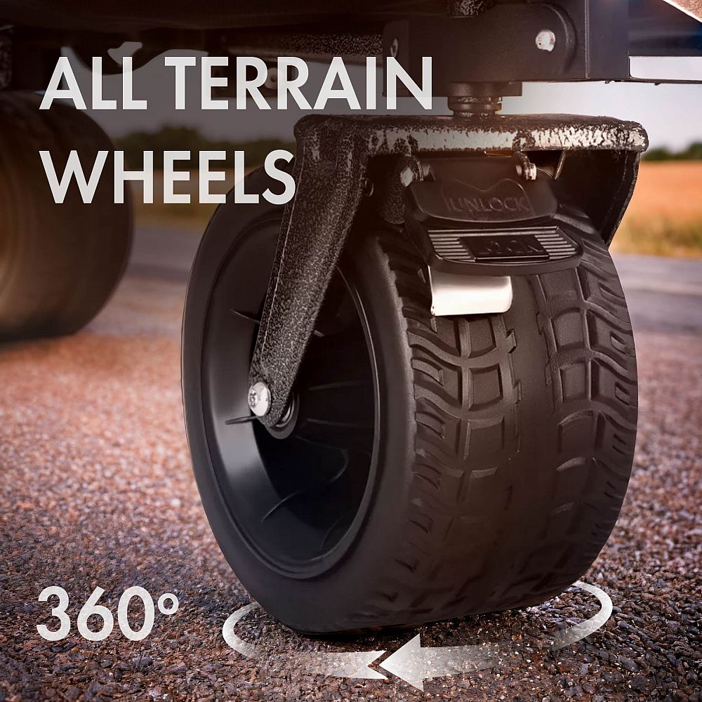 Korba vozíku je zhotovena z polyesteru v úpravě 600D Oxford, který je odolný proti oděru a vlhkosti. Materiál skvěle odolává intenzivnímu používání a zároveň se snadno udržuje v čistotě, což z něj činí ideální volbu pro venkovní aktivity.