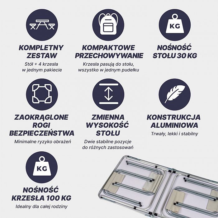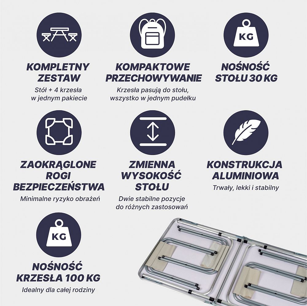 - Kompaktní a skladný: Díky promyšlenému designu se stůl a židle snadno skládají a vejdou se do sebe, takže zaberou minimum prostoru v batohu nebo autě.