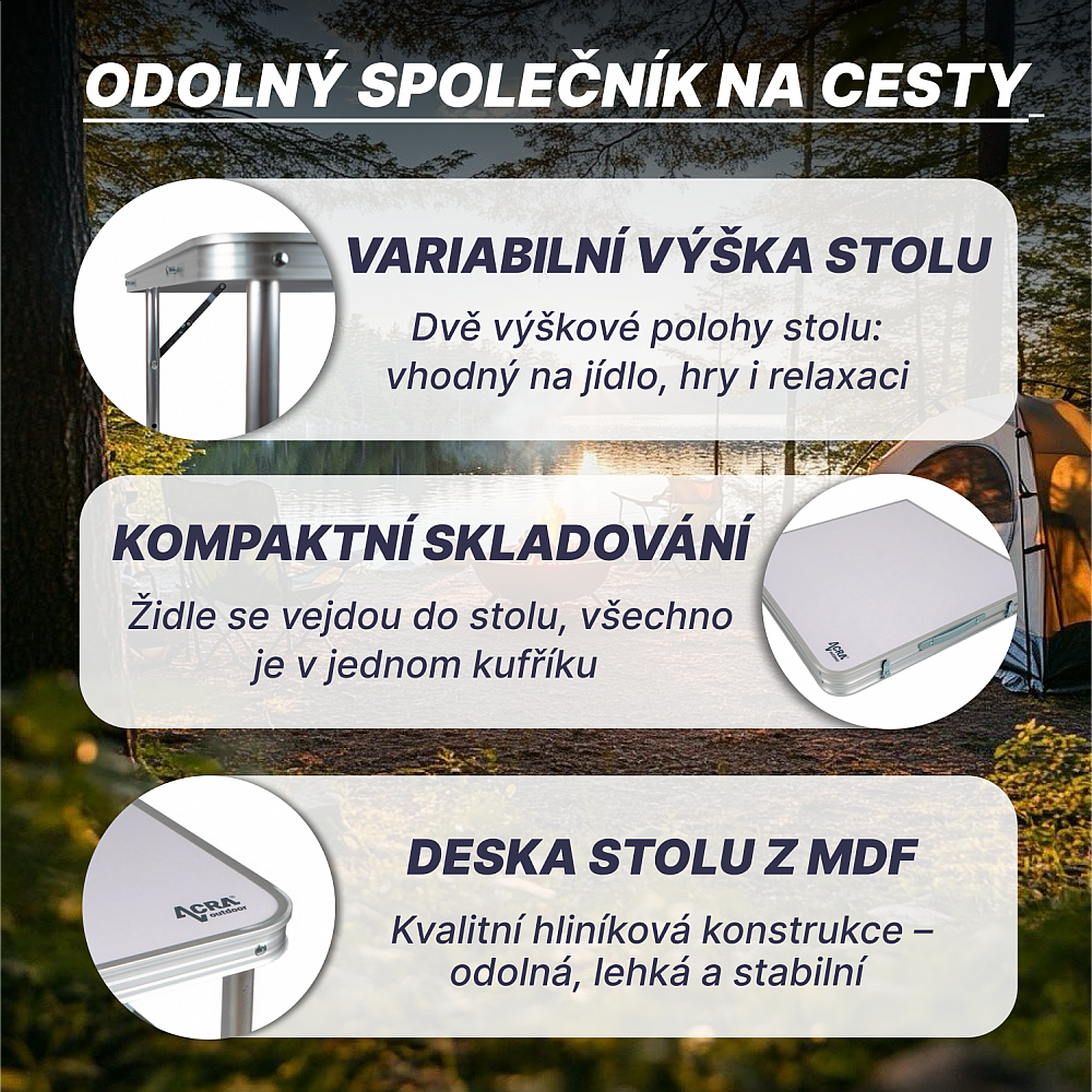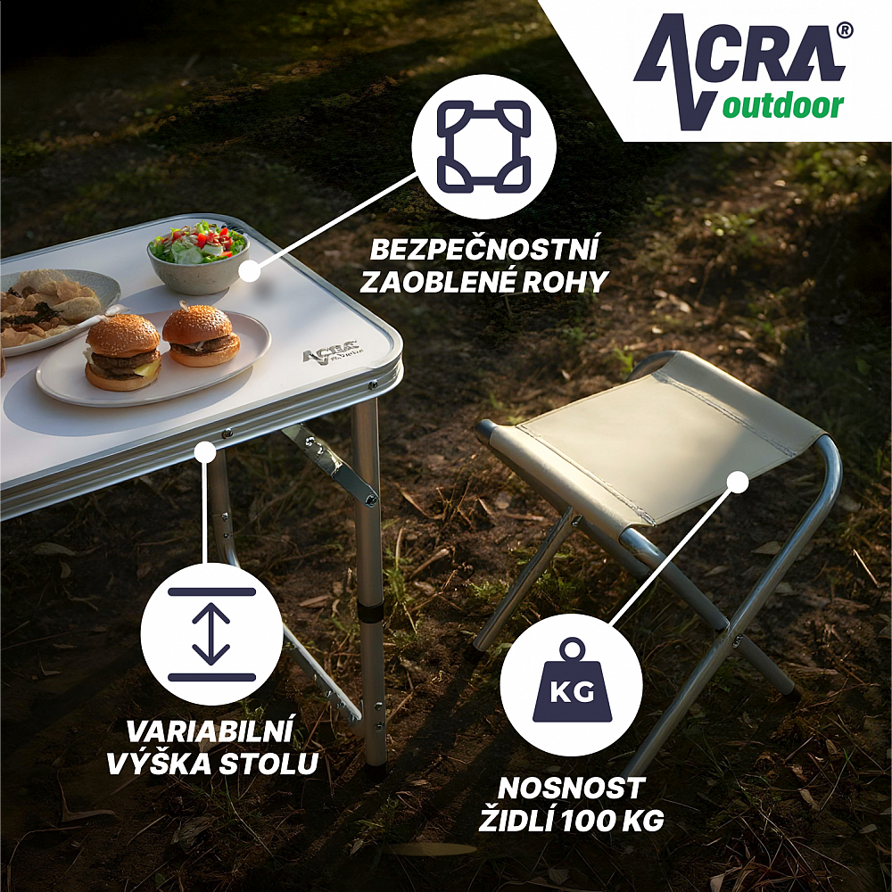 Kempingový set Acra C3L je ideální volbou pro všechny, kteří si cení praktického, odolného a stylového nábytku. Je perfektní pro rodinné výlety, do karavanu i na chatu.