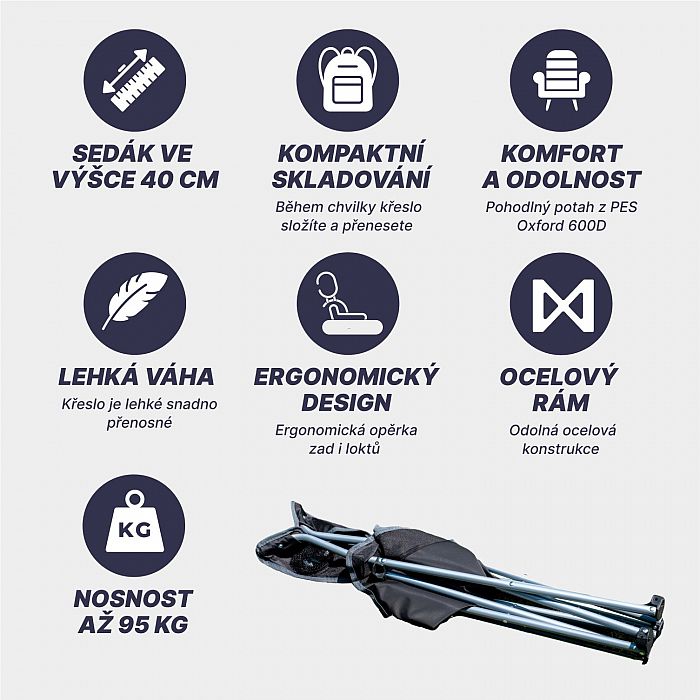 Skládací křeslo - univerzální. Konstrukce - ocelové trubky o průměru 16mm. Sedák opěrka a područky - PES Oxford 600 D.