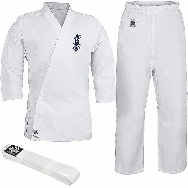Blůza kimona má široké spadlé rukávy v 3/4 délce a tmavě modrou výšivku Kyokushin na levé straně hrudi, která jí dodává osobitý vzhled.