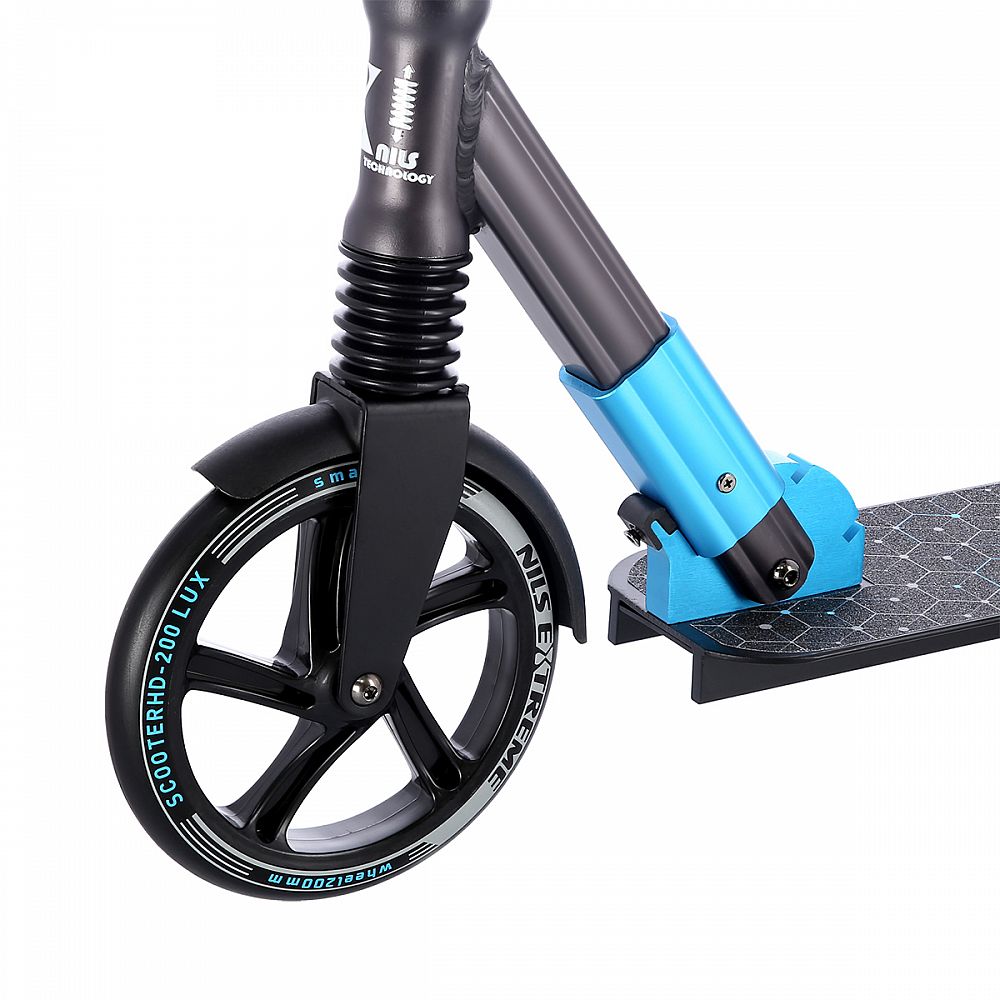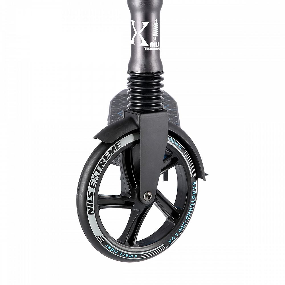 Koloběžka NILS Extreme HM200 je vhodná pro děti i dospělé. Charakteristikou modelu HM200 jsou tlumiče na předním i zadním kole, široká řídítka a výklopný stojánek.