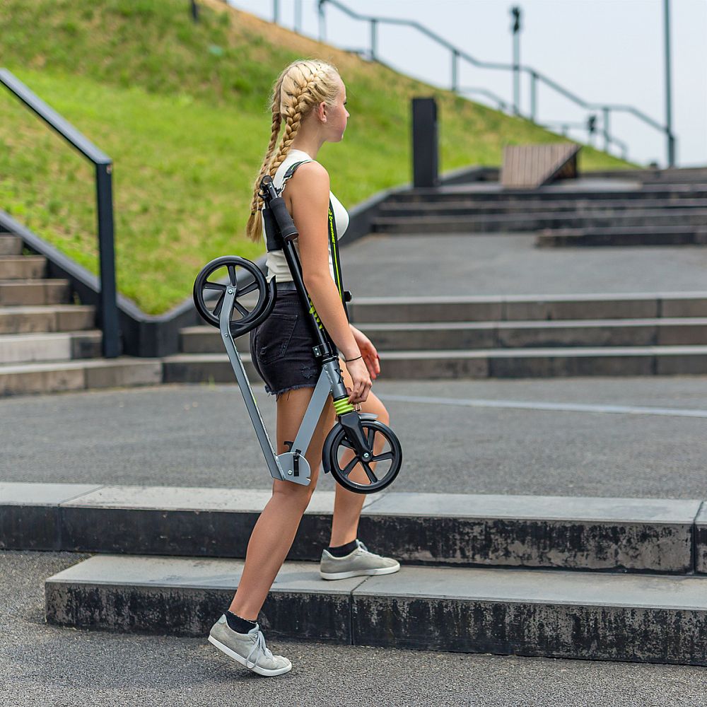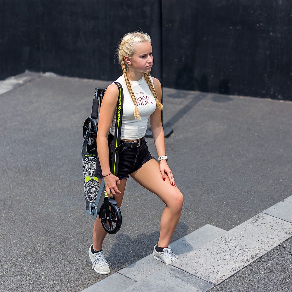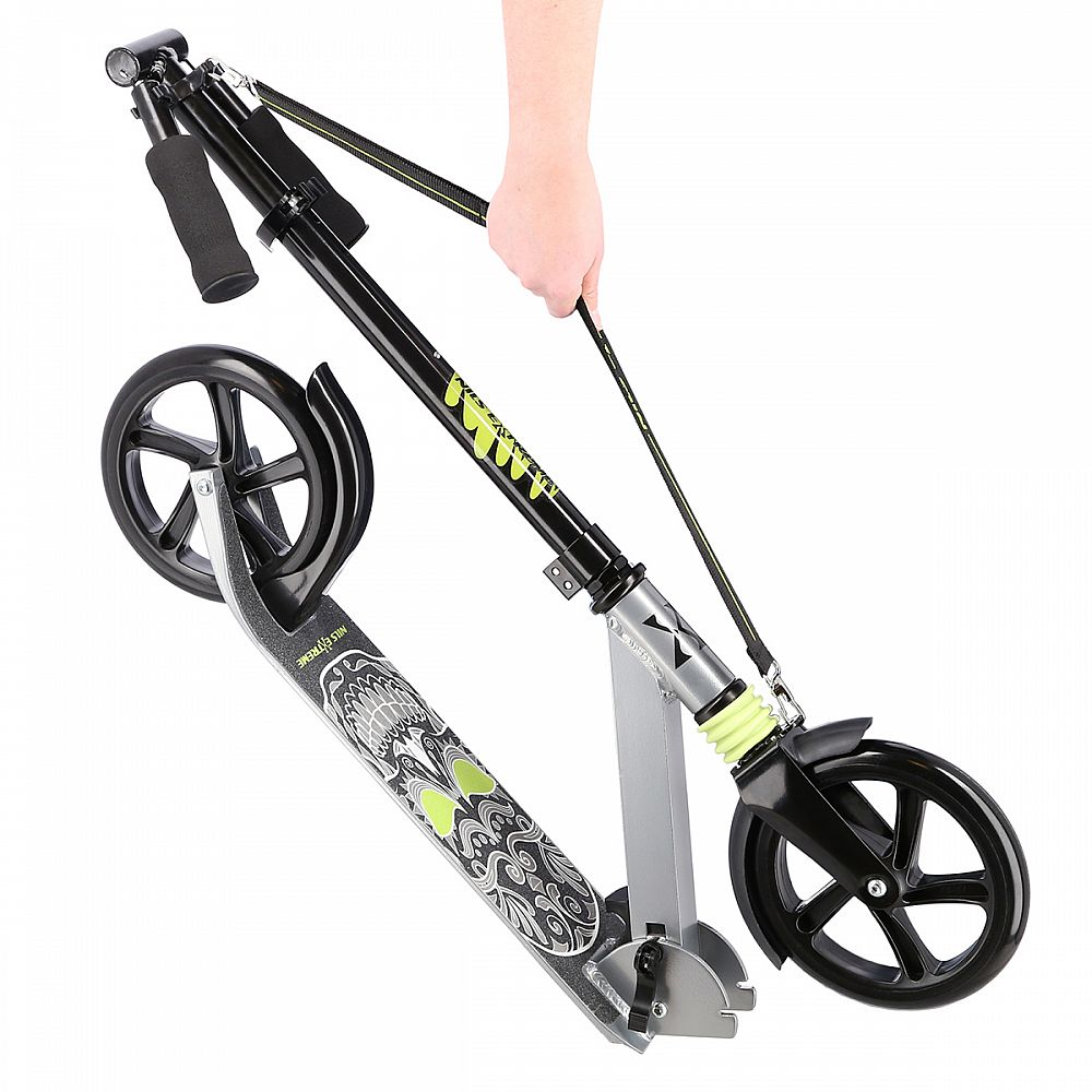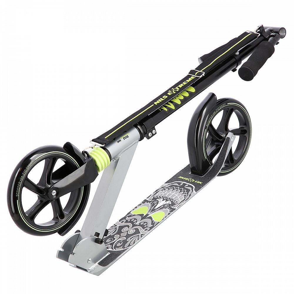 Koloběžka NILS Extreme HM210 je vhodná pro děti i dospělé. Charakteristikou modelu HM210 je tlumič na předním kole a praktický popruh přes rameno.
