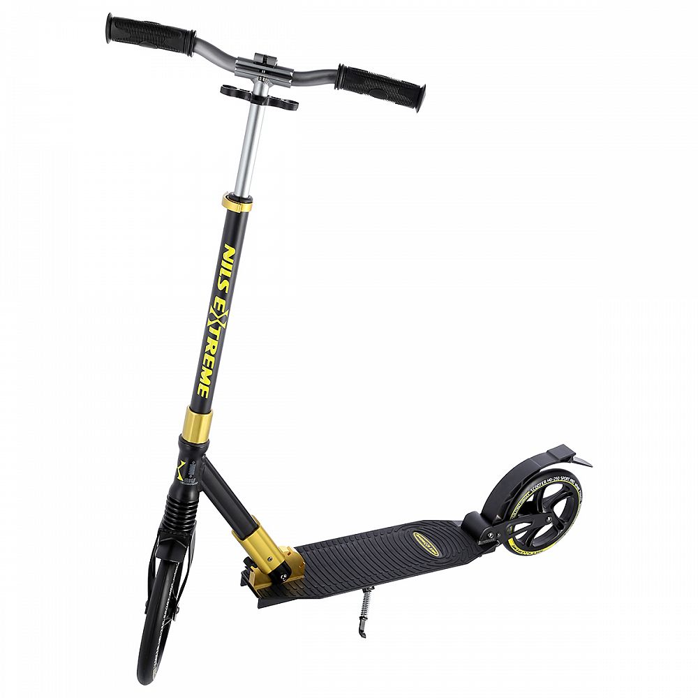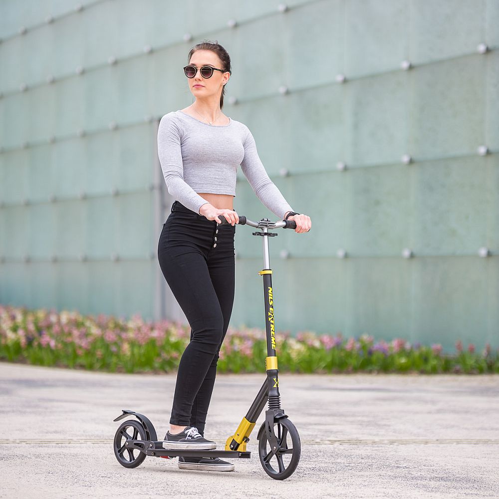 Koloběžka NILS Extreme HM255 je vhodná pro děti i dospělé. Charakteristikou modelu HM255 je tlumič na předním i zadním kole, široká řídítka a výklopný stojánek.