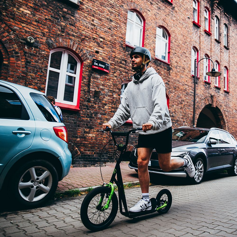 Rám koloběžky je vyroben z hliníkové slitiny, která kombinuje lehkost s odolností proti mechanickému poškození. Doplňují ho ocelová řídítka, která zajišťují tuhost a stabilitu při jízdě. Navzdory robustní konstrukci váží koloběžka pouhých 8,5 kg, což usnadňuje její přenášení, přepravu a každodenní používání - například při cestě do školy, do práce nebo na setkání s přáteli.