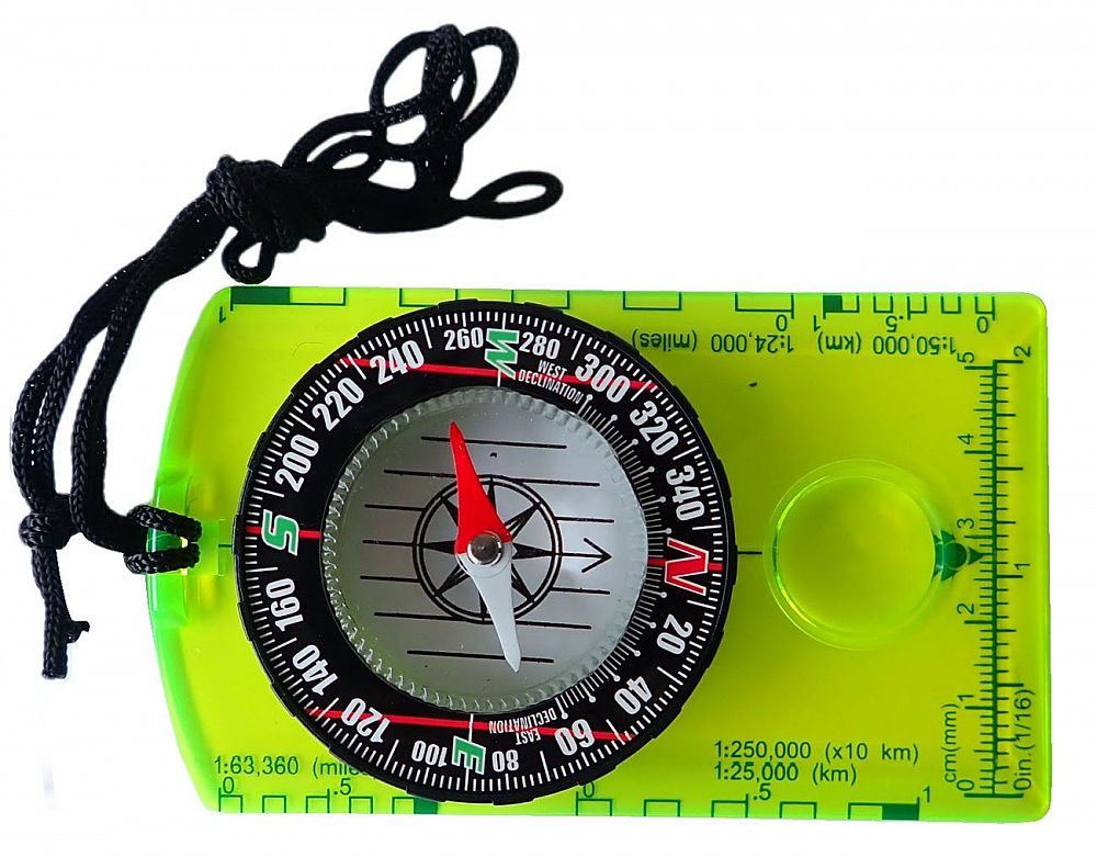 Buzola malá 114 x 62 mm. Buzola má směrovou šipku pro určení azimutu (úhlu pochodu), několik měřítek pro rychlé určení vzdálenosti na mapě a lupu pro čtení drobného textu. Buzola slouží pro orientační běh nebo pro turistiku a orientaci na mapě a v terénu. Součástí buzoly je šňůrka pro zavěšení buzoly na krk.