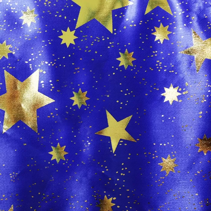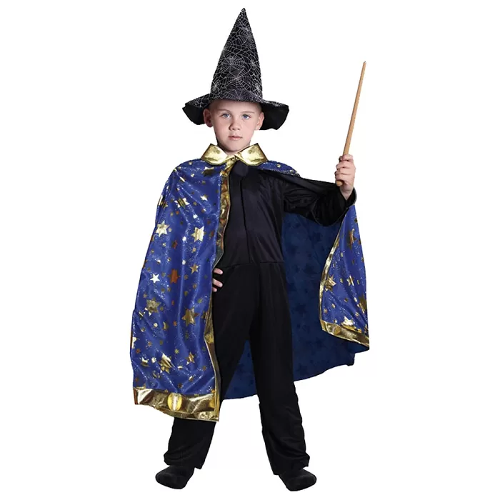 Kouzelnický plášť pro malé čaroděje. Plášť se dá zavázat a je dekorován zlatými hvězdičkami a lemováním. Ideální řešení na Halloween a karneval.