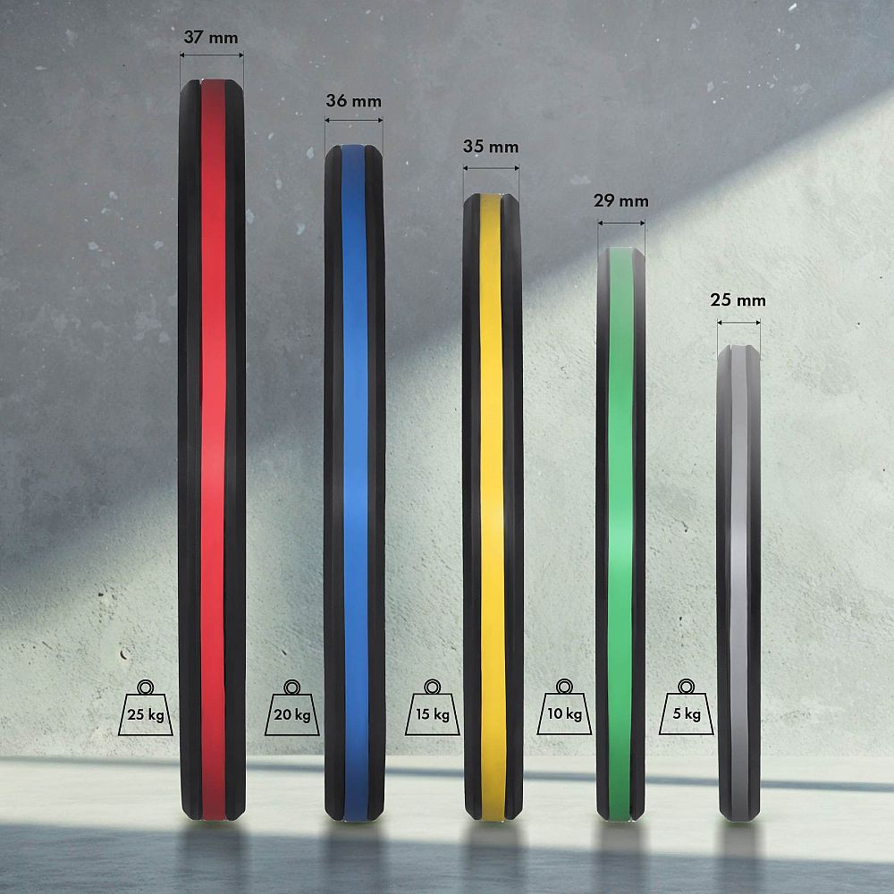 Kotouče TOG jsou dostupné v pěti variantách: 5; 10; 15; 20 a 25 kg. Jasné označení hmotnosti a barvy odpovídající mezinárodním standardům usnadňují rychlý výběr správného závaží během tréninku.