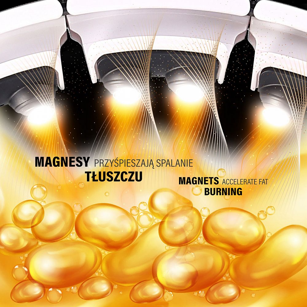 Magnetický hula hoop HHM16 je vynikajícím řešením, které pomáhá v boji se zbytečnými kilogramy umístěnými kolem břicha, boků a hýždí. Magnety, které jsou připevněny k vnitřnímu rámu obruče, jsou negativně polarizované. Toto uspořádání stimuluje metabolismus. Magnety jsou výkonově dokonale sladěny, takže o svou postavu můžete s HHM16 efektivně pečovat bez ohledu na váš věk nebo zdravotní stav! Pružiny umístěné ve výstupcích umístěných po celém vnitřním obvodu smyčky pohybem o 360 stupňů dokonale absorbují přetížení a přizpůsobují se tělu, což vytváří dodatečný masážní efekt a poskytuje tělu příjemný pocit. Trojrozměrná masážní technika rychle stimuluje svaly. Vestavěné výstupky se speciálně vyvinutým tvarem mají tlumí rázy pro pohodlný trénink. Intenzitu vibrací upravíte změnou rychlostí kroužení boků.