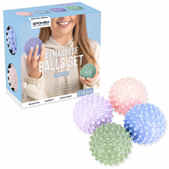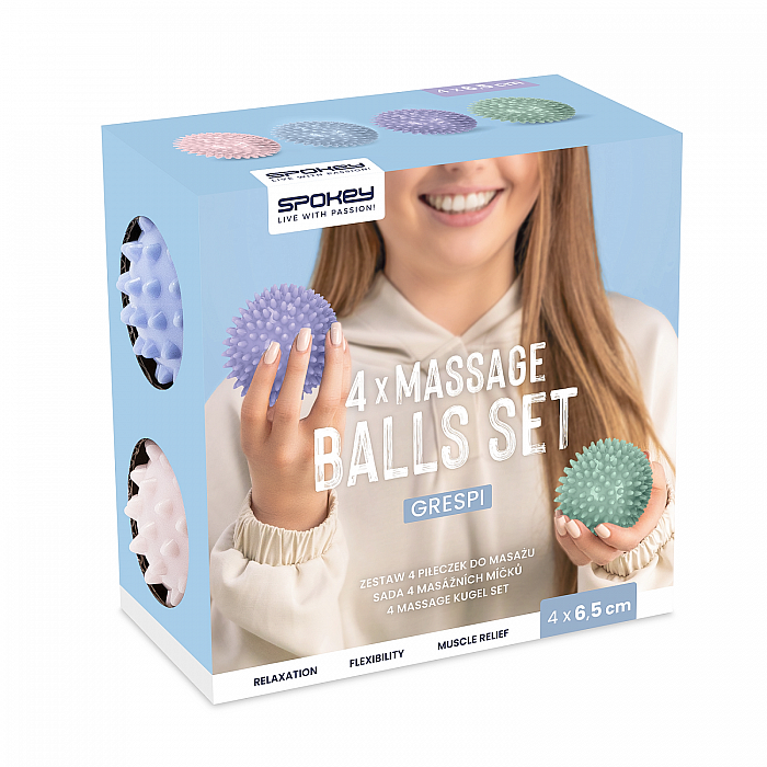 Sada GRESPI PASTEL se skládá ze 4 masážních míčků o průměru 6,5 cm s různým stupněm tvrdosti, což vám dává možnost zvolit si míček podle typu bolesti či svalového napětí v dané části těla, která vyžaduje masáž. Míčky mohou být také použity během tréninku k posílení břicha, chodidel, nohou, krku, ramenou či rukou. Dokonale se hodí i při boji s celulitidou nebo nastartování krevního oběhu. Díky jejich struktuře si zároveň během cvičení můžete dopřát jemnou či intenzivní masáž. Míčky GRESPI jsou vhodné i pro antistresová cvičení.