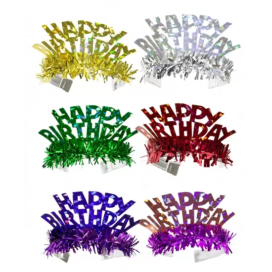 Barevné čelenky s nápisem Happy Birthday jsou ideálním doplňkem na narozeninovou oslavu. Velikost: univerzální.Balení: 6 ks