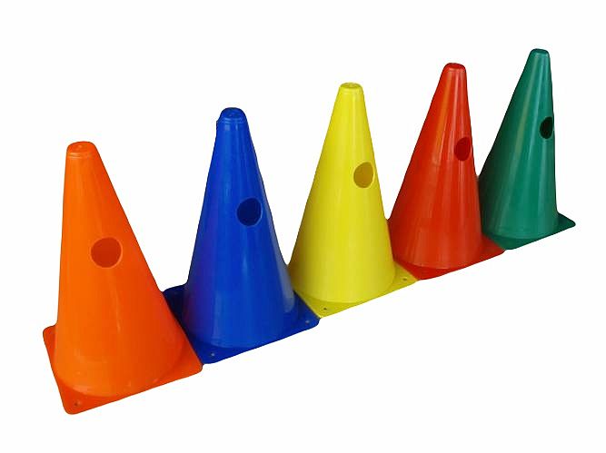 Na rozdíl od klasického kužele má tento kužel otvory pro zasunutí tyče což umožňuje vytvoření překážkové dráhy.