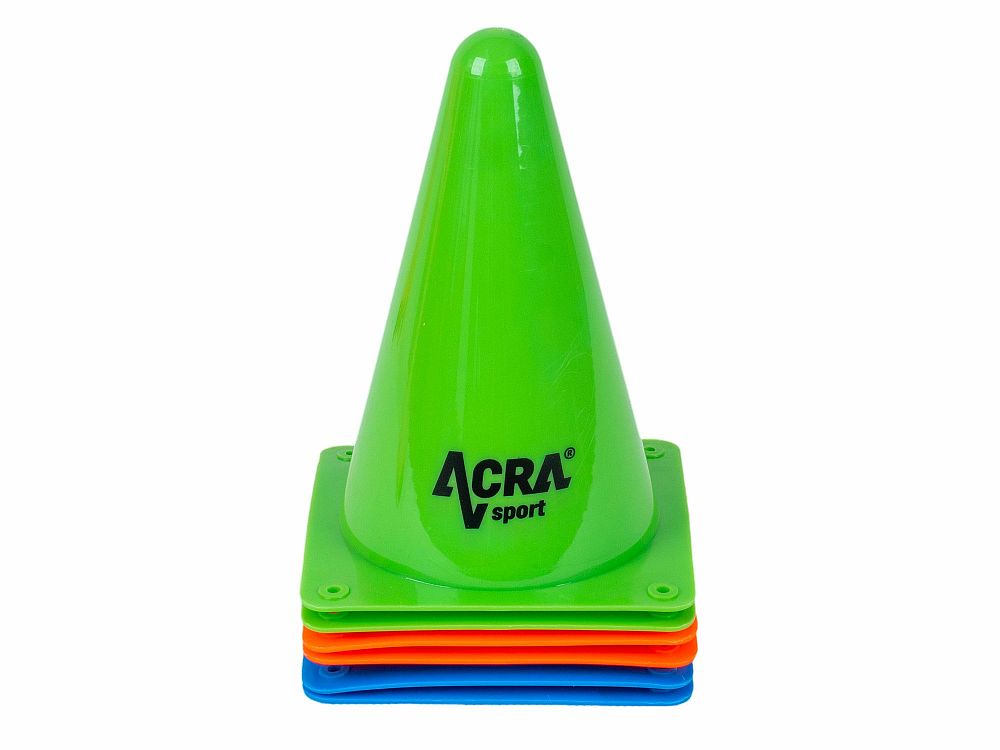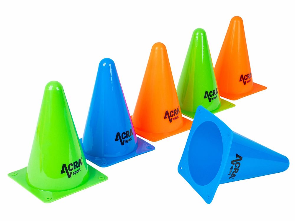 Tréninkové kužely Acra tvoří sadu šesti kusů, ideální pro sportovní trénink a různé pohybové aktivity. Sada obsahuje dva modré, dva zelené a dva oranžové kužely, což umožňuje snadné rozlišení a organizaci během tréninku.