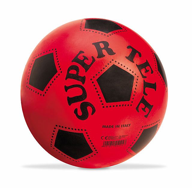 Míč potištěný gumový Super Tele - 230 mm. Jedná se o lehký plastový míč určený na hraní dětí, potisk imituje fotbalový míč. Použití je možné i ve vodě. K dispozici v barvě žluté, červené, modré a bílé. Barvu prosíme specifikovat v poznámce objednávky.Dodavatel: Mondo S.p.A., Via Garibaldi M. 192, Gallo d Alba-Itálie 120 60, 390173366607, info@mondoita.com