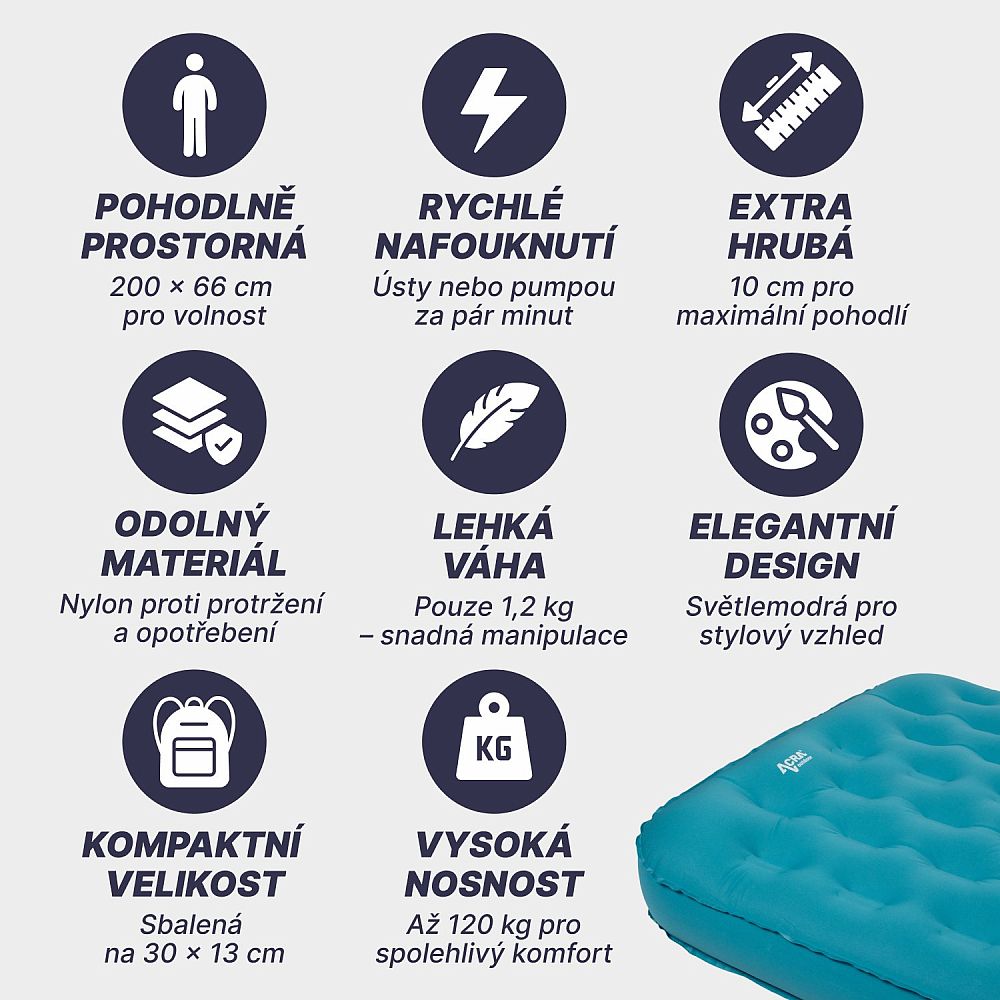 Popis: ACRA L140MO Komfortní nafukovací karimatka modrá 10cm a délkou 200cm