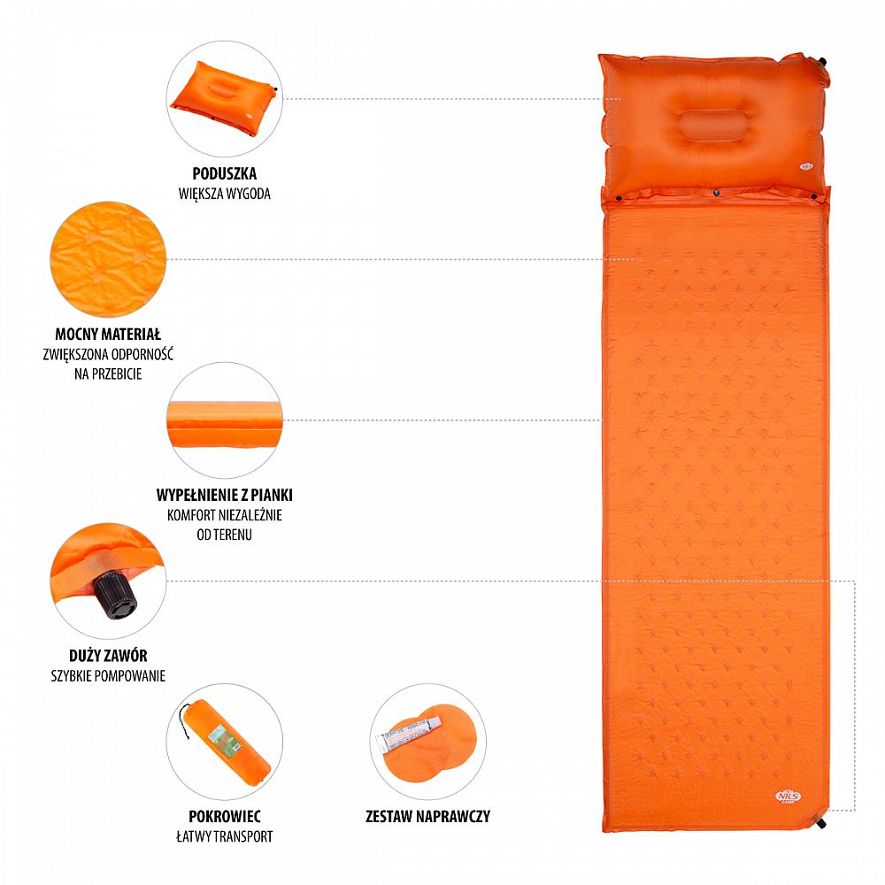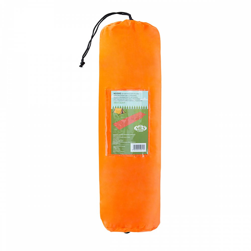 Samonafukovací karimatka NILS CAMP NC4345 zajistí kvalitní spánek během kempování a dovolených pod stanem. Podložka je ale vhodná i k vodě a všude tam, kde si chcete příjemně poležet. Samonafouknutí zajišťuje vnitřní, pěnový materiál s otevřenými póry. Po povolení ventilu do sebe nasává vzduch a dostává se tak do původního stavu. Závěrem je ještě potřeba podložku dofouknout na požadovanou tvrdost. Skládání se provádí otevřením ventilu a srolováním od opačné strany, než je ventil. Karimatku poté vložíte do dodávaného vaku. Na model NC4345 byl použit velice odolný polyester 190T potažený vrstvou PVC, tato kombinace zajišťuje vysokou odolnost a karimatka se dá položit i na nerovný povrch. Polštářek je odnímatelný a oproti karimatce není vyplněn pěnou a je potřeba ho celý nafouknout. Součástí balení je také opravná sada, která se hodí v případě poškození.