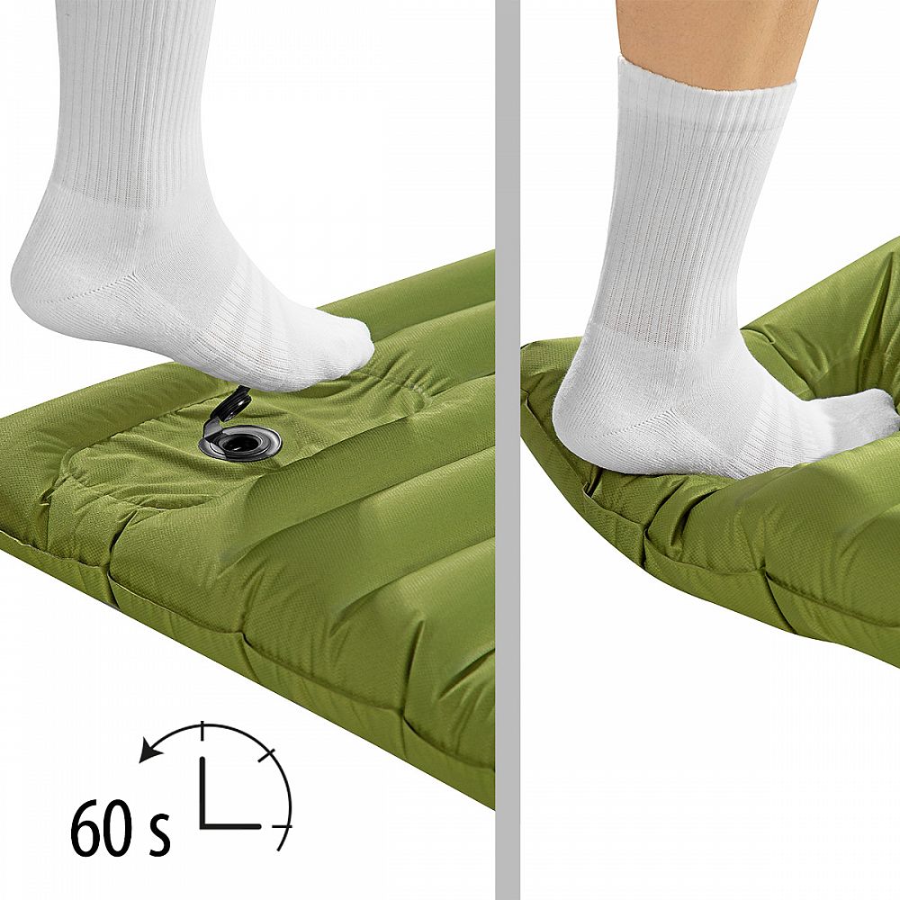 Karimatka má zabudovanou nožní pumpu, která karimatku velmi rychle napumpuje. NC4101 stačí položit na zem, otevřít černý ventil a zavřít šedý ventil. Poté nohou svižně sešlapujte pumpu (v oblasti černého ventilu). Pohyby by měly být rychlé a krátké. Doslova jedna minuta stačí k tomu, aby byla podložka připravena k použití! Jakmile podložka dosáhne správné úrovně nafouknutí, uzavřete černý ventil. Podložka NC4101 dosahuje při plném nafouknutí úctyhodné tloušťky 10 cm, což zaručuje pohodlný odpočinek a spánek i těm nejnáročnějším uživatelům.