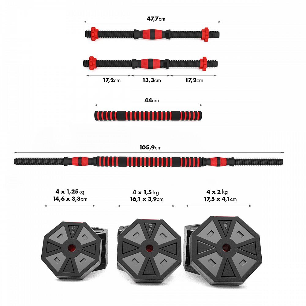 Kotouče jsou vyrobeny z trvdého plastu, který je vyplněn cementem. Obouruční osa je spojovacím dílem, do kterého se všroubují hřídele jednoručních činek. Nakládací trny jsou opatřeny závitem a závaží se zajišťuje pomocí hvězdicových matic. Šestihranný tvar kotoučů navíc zamezuje jejich odvalování. Činky se Vám tak nikam neodkutálí a budete je mít vždy tam, kde jste je odložily.