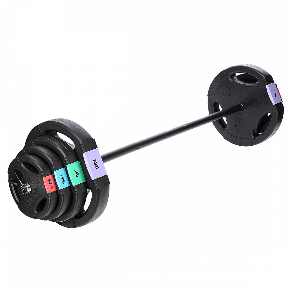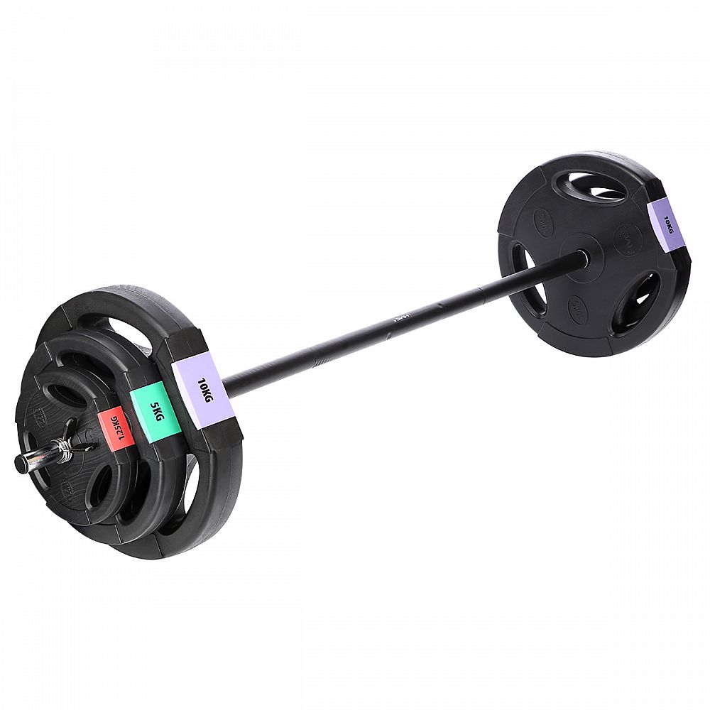 Kotouče jsou vyrobeny z trvdého plastu, který je vyplněn cementem. Obouruční osa je tvořena ze tří částí, které se do sebe skládají pomocí šroubení. Nakládací trny jsou hladké a závaží se zajišťuje pružinovými svorkami. Trny jednoručních činek jsou opatřeny závitem a závaží je jištěno hvězdicovými maticemi.
