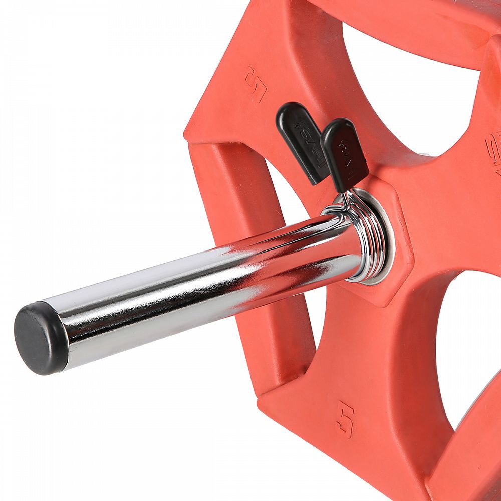 Svorky jsou vyrobeny z 3 milimetry silného, ocelového drátu. 3 závity zajišťují dostatek přítlačné síly i pro dynamický trénink. "Křidýlka" jsou naklopena na jednu stranu, takže objímku jde nasadit úplně ke kotouči, tím dochází k lepšímu zajištění, než u podobných svorek, které mají "křidýlka" v ose objímky. Plastové krytky zvyšují pohodlí při manipulaci se svorkami.