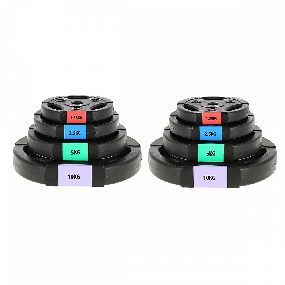 Sada obsahuje 1 skládací, nakládací osu, 2 uzávěry a 8 kotoučů různých vah.