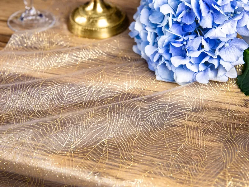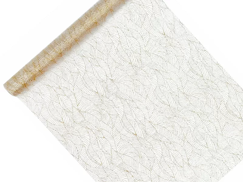 Popis: Organza potištěná, zlatý potisk listy 0.48x9m