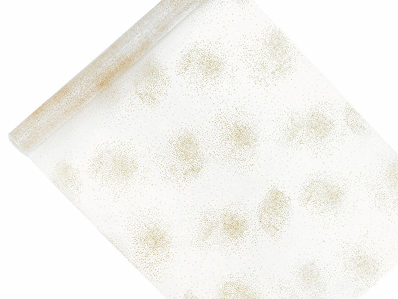 Popis: Organza potištěná, zlatý potisk tečky 0.48x9m