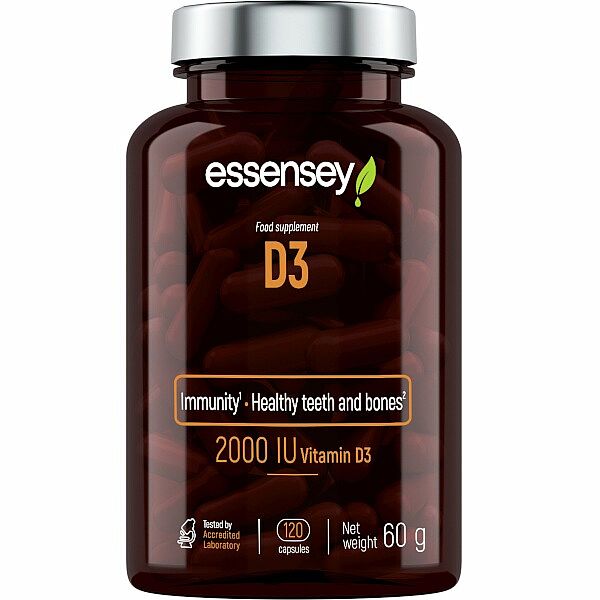 ESSENSEY D3. Doplněk stravy. Přípravek v kapslích obsahuje 2000 IU vitaminu D3 v doporučené denní dávce. Vitamin D podporuje imunitu a přispívá k udržení normálního stavu kostí a zubů.