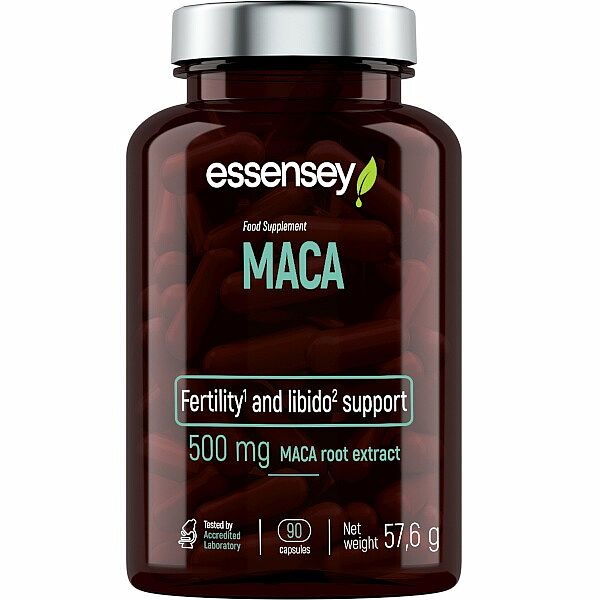 ESSENSEY MACA. Doplněk stravy. Přípravek v kapslích obsahující extrakt z kořene pepřovníku peruánského (Lepidium meyenii), obsahuje 500 mg extraktu v každé kapsli. MACA má příznivý vliv na plodnost. MACA pomáhá udržovat přirozenou sexuální aktivitu a energii.