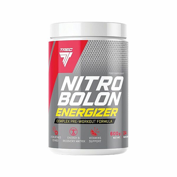 NITROBOLON ENERGIZER. Doplněk stravy. S cukry a sladidly. Obsahuje kofein. Nedoporučuje se pro děti nebo těhotné ženy (150 mg na denní dávku – 25 g). Tropická příchuť. Komplexní předtréninkový přípravek. NITROBOLON ENERGIZER je vícesložkový předtréninkový „stack“. Obsahuje kreatin, který zlepšuje účinnost při následné krátké velmi intenzivní fyzické aktivitě. Příznivý efekt nastává při konzumaci 3 g kreatinu denně. NITROBOLON ENERGIZER se doporučuje pro sportovce disciplín zahrnujících sílu, rychlost a také vytrvalost. Doporučená denní porce je 25 g (4 odměrky).