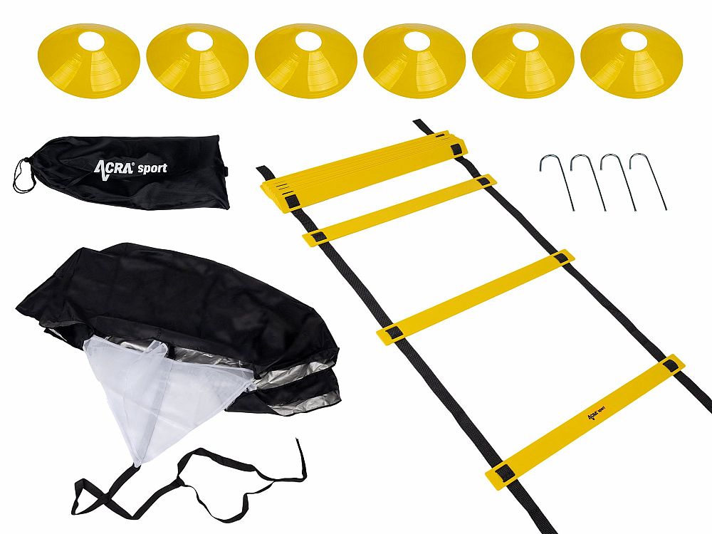Tréninková Agility sada Basic Acra je skvělým pomocníkem pro vaše tréninky v tělocvičně i venku. Agility překážky jsou vhodné pro sportovce napříč různými sportovními obory, kluby i školy. S touto sadou si můžete zlepšit kondici a efektivně trénovat rychlost a koordinaci jak dolních, tak horních končetin. Sada pro základní trénink Acra obsahuje odporový padák na běhání, šest vytyčovacích met a jeden agility žebřík s nastavitelnými žlutými lamelami o délce 6 m. Součástí sady je i praktický vak z polyesteru s popruhem přes rameno, který usnadňuje přenášení a uskladnění mezi jednotlivými tréninky.