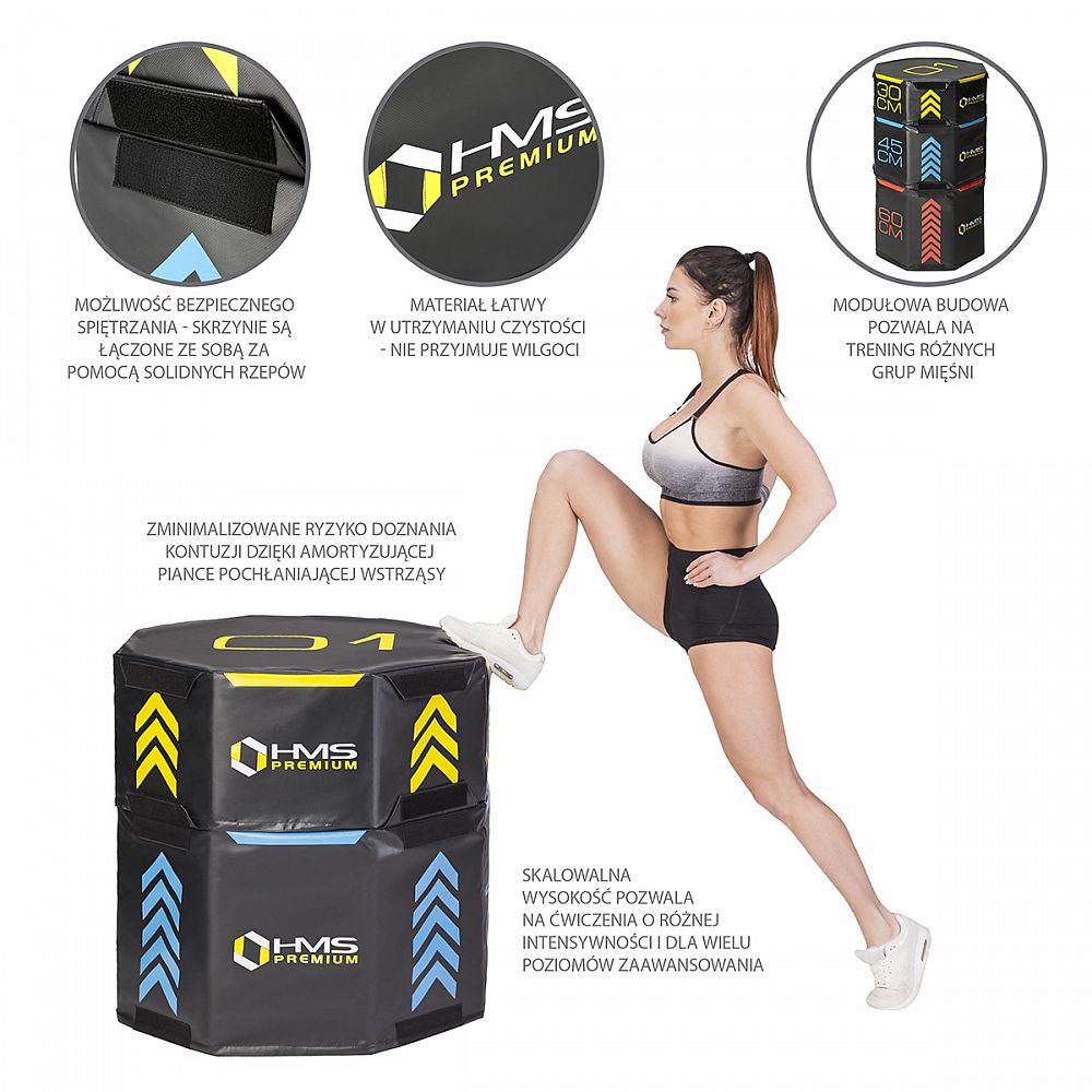 HMS Premium PYOBS01 je sada tří měkkých, osmihranných plyometrických skříní o různé výšce.