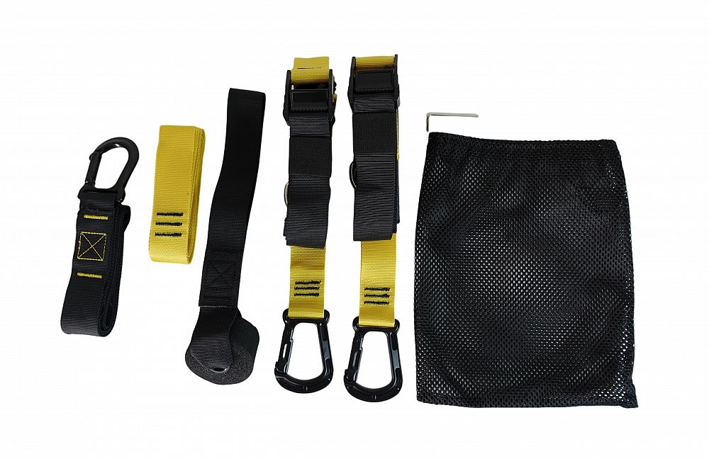 - Flexibilní nastavení: Systém kovových přezek umožňuje rychlé a jednoduché nastavení délky popruhů, což umožňuje snadné přizpůsobení obtížnosti cvičení.
