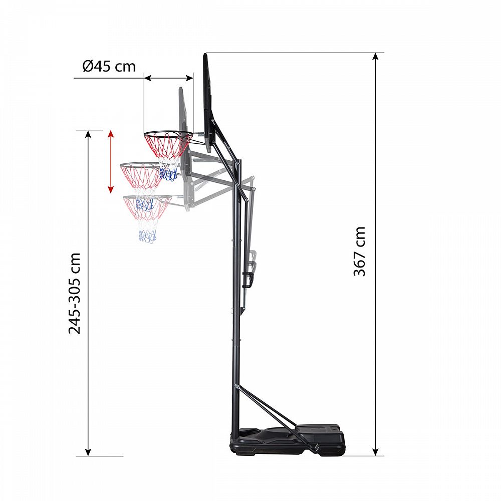Díky možnosti nastavení výšky se koš dokonale přizpůsobí vašim potřebám. Ať už jste začátečník, nebo zkušený šampion, náš koš vám poskytne dokonalé nastavení pro maximální využití vašeho potenciálu. Změna výšky se provádí uchopením madla, stisknutím tlačítka a posuvem madla po regulační tyči, která je cejchovaná, abyste okamžitě věděli, v jaké výšce se aktuálně nachází obruč. Výšku obruče lze nastavit do 5-ti úrovní v rozsahu od 2,45 do 3,05 metru.